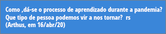 - Todos nós vivenciamos nosso processo de aprendizado em 4 momentos distintos. Durante a crise da covid19 manifestamos um comportamentos que são bem característicos de cada uma das fases do aprendizado. O importante é não ficarmos preso por muito tempo nos primeiros estágios desse processo, de forma a chegar o quanto antes no quarto momento.